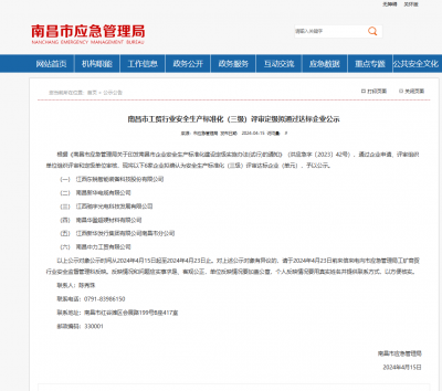 2024年4月15日,飞艇168官方开奖历史取得了南昌市工贸行业安全生产标准化(三级)评审定级拟通过达标企业公示...