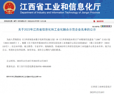 2023年12月19日,东锐取得了关于2023年江西省信息化和工业化融合示范企业名单的公示...
