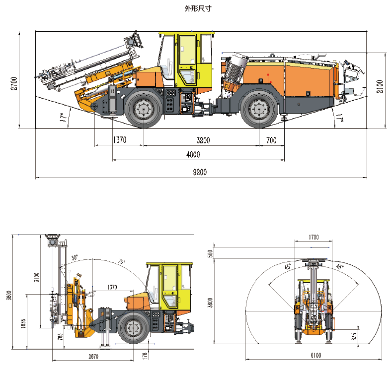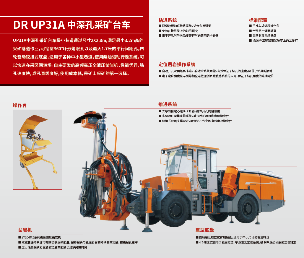 UP31A中深孔采矿台车,适用于中小型巷道的采矿作业。台车配备ZY104MZ凿岩机,钻凿φ64-102mm,孔深42m的中深孔,先进的电比例负载敏感操作系统的应用,将给你带来高精准的钻孔体验。