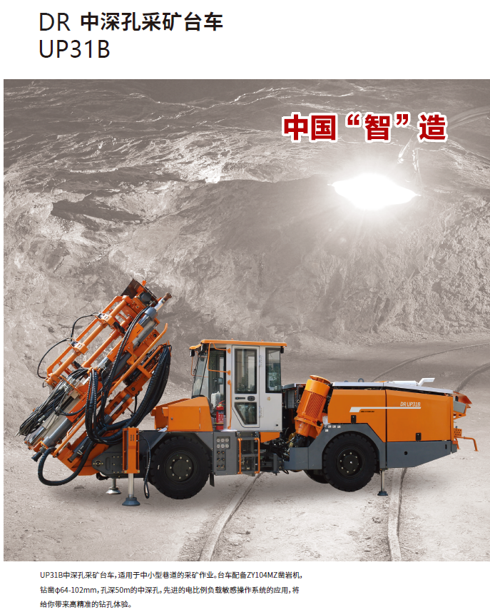UP31B中深孔采矿台车,适用于中小型巷道的采矿作业。台车配备ZY104MZ凿岩机,钻凿φ64-102mm,孔深50m的中深孔,先进的电比例负载敏感操作系统的应用,将给你带来高精准的钻孔体验。