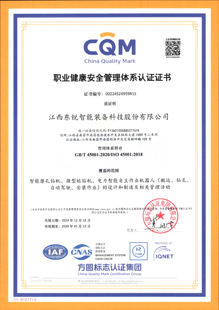 职业健康安全管理体系认证证书